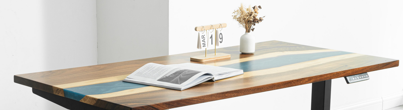 Epoxy tabletops are a stunning mix of real wood toughness and a modern resin touch. The resin adds a shiny finish, highlighting the wood's patterns and colors. These solid wood tops are built to last, withstanding daily heavy use. Plus, each epoxy desk top looks awesome, with the vibrant resin smoothly blending in with the natural wood grain.